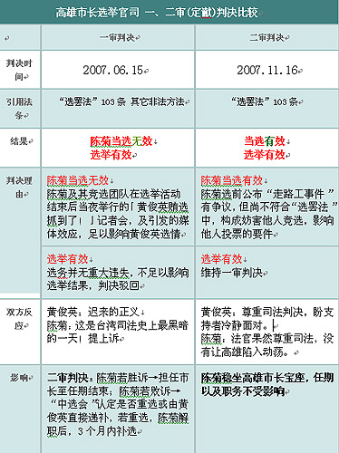 中新網(wǎng)11月16日電 高雄市長(zhǎng)選舉官司二審今天下午二審宣判,改判陳菊當(dāng)選有效,選舉無(wú)效之訴仍維持一審判決予以駁回,全案定讞。被告陳菊及原告黃俊英都未到庭聆判。
