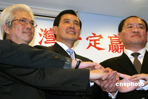 馬英九(中)與其辯護(hù)律師將手緊緊搭在一起。中新社發(fā) 董會(huì)峰 攝