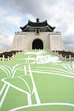 紀(jì)念館正面樓梯的中央改以巨大百合花布幕。圖:臺(tái)灣《聯(lián)合報(bào)》