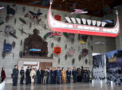 據(jù)臺(tái)灣中廣新聞報(bào)道,進(jìn)入主建筑物的二樓銅像大廳可以看到,蔣介石銅像仍維持原貌,但整個(gè)大廳裝飾了巨幅海報(bào)與歷史政治運(yùn)動(dòng)照片等,還垂掛風(fēng)箏以及“原住民“達(dá)悟魚舟紙做模型。