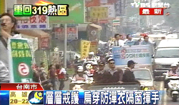 下午四點(diǎn)左右,陳水扁站在宣傳車上從臺(tái)南南定橋出發(fā)。與上次不同的是,宣傳車加高防護(hù),蓋住了他的招牌鮪魚肚。車隊(duì)在臺(tái)南市大街小巷穿梭,接近五點(diǎn)便來(lái)到當(dāng)年槍響的金華路,并做短暫停留。