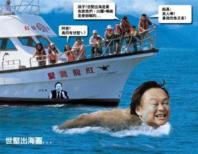 據(jù)臺灣東森新聞報道,王世堅夸下海口,只要“立委”選戰(zhàn)臺北市國民黨八仙過海,拿到所有席次他會跳海。如今為了這個承諾,媒體緊迫盯人,生怕一不小心漏掉這則跳海新聞,最新版本則傳出他將在臺北縣萬里碼鋉漁港跳海,雖然未獲證實,但相關單位都派駐大批人力,前往漁港附近待命以防意外發(fā)生。
