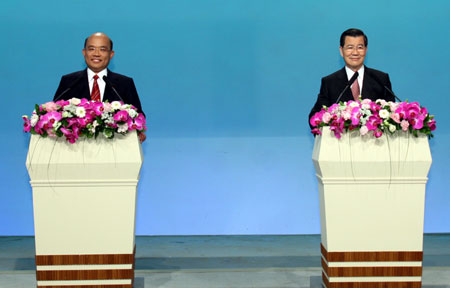 中新網(wǎng)3月10日電 臺(tái)灣地區(qū)領(lǐng)導(dǎo)人選舉唯一一場(chǎng)副領(lǐng)導(dǎo)人候選人電視政見(jiàn)發(fā)表會(huì)今晚登場(chǎng),國(guó)民黨副領(lǐng)導(dǎo)人候選人蕭萬(wàn)長(zhǎng)與民進(jìn)黨副領(lǐng)導(dǎo)人候選人蘇貞昌透過(guò)兩輪交叉方式發(fā)表政見(jiàn),他們互相批評(píng)對(duì)方領(lǐng)導(dǎo)人候選人的經(jīng)濟(jì)與兩岸政見(jiàn),要選民選擇真正愛(ài)臺(tái)灣、守護(hù)臺(tái)灣的領(lǐng)導(dǎo)人。