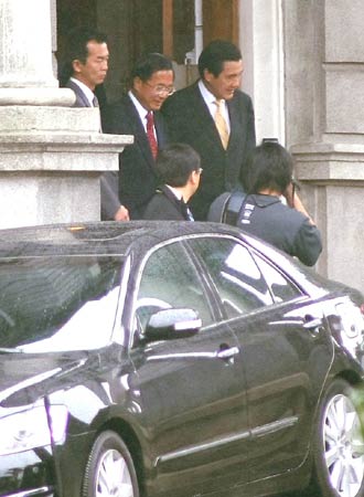 會(huì)談結(jié)束后,陳水扁親自到門口送馬英九搭車離去。(圖片來源:“中央社)