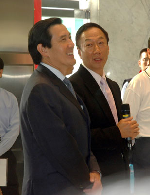 據(jù)“中央社”報道,郭臺銘今天下午四時,在位于臺北縣土城市的鴻海精密公司,親自迎接馬英九的到來。一進入公司大廳,郭臺銘向馬英九介紹張貼在大廳梁柱的一幅對聯(lián)。