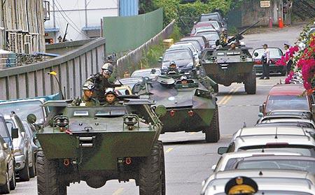 在裝甲車護(hù)送下,陳水扁及“部會(huì)首長(zhǎng)”進(jìn)行指揮所轉(zhuǎn)移演練,過(guò)程逼真。