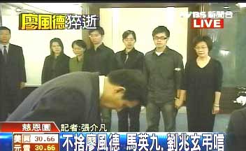 據(jù)臺灣TVBS報道,廖風德因病猝逝可謂“驟失英才”,讓人措手不及,他的家人在慈恩園為他布置靈堂,在今天上午10點開始讓親友吊唁,面色凝重的馬英九、準“行政院長”劉兆玄、“立委”蔣孝嚴也來到靈堂送他最后一程。