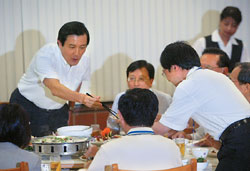 報道說,馬英九一坐下來,就拿起筷子準(zhǔn)備開動。馬英九替每位“閣員”夾菜,把白斬雞夾到“閣員”的盤子上時,還不忘沾下醬油,相當(dāng)細(xì)心。