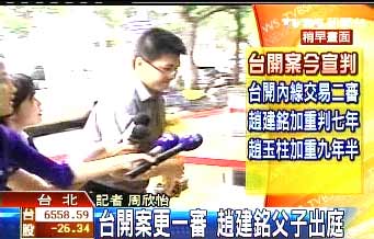 據(jù)臺(tái)灣TVBS報(bào)道,臺(tái)開案今天“高院”更一審開庭,上午8點(diǎn)40分時(shí)趙玉柱抵達(dá)法院,隨后8點(diǎn)55分趙建銘也抵達(dá),對(duì)于陳幸妤昨天說(shuō)自己身體也不好,趙建銘只是微笑沒有回答,之后快閃進(jìn)了法院。