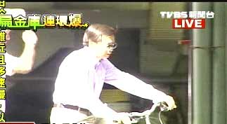 黃志芳帶著墨鏡,騎著腳踏車來到特偵組接受約談 臺灣TVBS圖