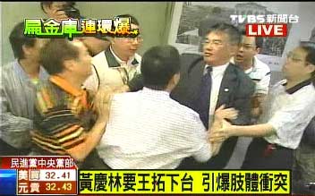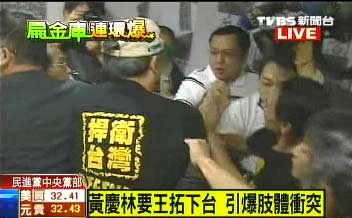 中新網(wǎng)10月13日電 民進(jìn)黨秘書長王拓指陳水扁違反民進(jìn)黨大是大非的一席話,不僅引起陳水扁反批,今日(13日)更在黨內(nèi)嚴(yán)重爆發(fā)分裂危機(jī)。民進(jìn)黨臺北市黨部主委黃慶林上午前往中央黨部找王拓理論,雙方人馬當(dāng)場就互相拉扯,爆發(fā)嚴(yán)重沖突。