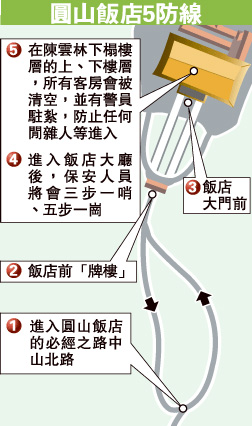此外,臺(tái)警方31日也陸續(xù)在圓山飯店前的牌樓、忠烈祠、北安公園路口等放置拒馬,晚上6時(shí)許,保一總隊(duì)駐扎飯店門(mén)口,制服與便衣警員則定時(shí)入內(nèi)視察。警方表示,屆時(shí)將派40名霹靂小組干員,全天候貼身保護(hù)陳云林,每天至少有800名警員執(zhí)勤;若抗議者施放沖天炮,恐引發(fā)火警,一旦逮捕違規(guī)者,警方一律移送法辦,確保陳云林在臺(tái)期間的人身安全。