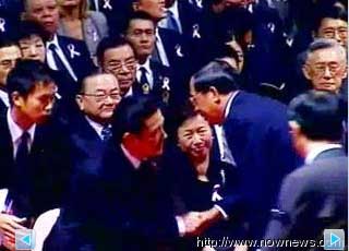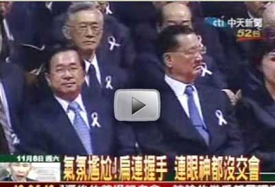 此時,馬英九起身回禮,扁、馬短暫交流,隨后陳水扁和“副總統(tǒng)”蕭萬長夫人朱俶賢及“前副總統(tǒng)”連戰(zhàn)也握手致意,但馬英九之前見陳水扁上前還禮貌起身,相形之下,朱俶賢與連戰(zhàn)則是坐著握手,一旁的連方瑀連看都不想看陳水扁。