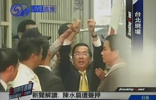 11月11日,臺檢方偵辦機要費案及陳水扁家庭疑洗錢案,今天上午第五度以被告身份傳喚陳水扁到案說明。經(jīng)過6個多小時的偵訊后,陳水扁被檢方聲請羈押禁見,并銬上手銬,移送到臺北地方法院開羈押庭,等待法官裁決是否要收押。圖片來源:電視截圖