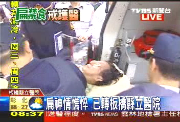 陳水扁收押后因絕食致身體虛弱,16日被戒護送至臺北看守所附近的亞東醫(yī)院。當晚經過對陳水扁進行一定檢查及打點滴,陳水扁目前無生命危險。