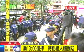 還押車隊(duì)緩緩駛出臺(tái)北縣立板橋醫(yī)院,警察在一旁以人墻隔出安全距離,由維安特勤開(kāi)道,救護(hù)車在旁待命。