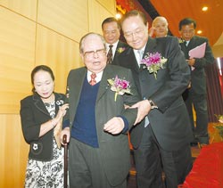 關(guān)中1日就任臺(tái)當(dāng)局“考試院長”一職,完成印信交接后,關(guān)中(前右)扶前任“院長”邱創(chuàng)煥(左二)下樓梯,頗有接棒的意涵。(來源:臺(tái)灣《中國時(shí)報(bào)》)
