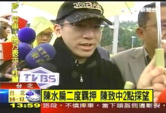 中新網12月30日電 據(jù)臺灣TVBS報道,陳水扁第二度遭到羈押,由于沒有禁見,他的兒子陳致中在今天下午兩點到臺北看守所探視。