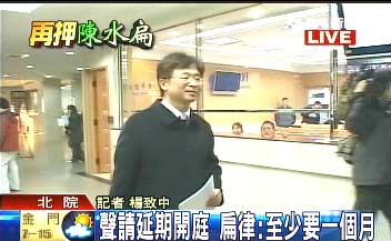 中新網(wǎng)1月14日電 據(jù)臺(tái)灣TVBS報(bào)道,陳水扁律師石宜琳14日下午出現(xiàn)在北院,他在4點(diǎn)遞狀,聲請(qǐng)1月19日至21日的準(zhǔn)備程序庭延期,他以卷宗太多尚未看完,以及律見30分鐘無法與扁詳細(xì)討論案情為理由,希望延期至少1個(gè)月。