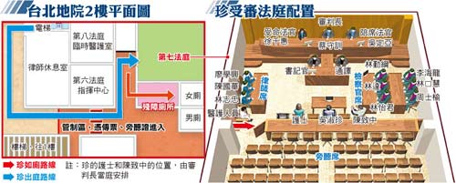 合議庭考慮吳淑珍身體狀況,預(yù)計(jì)這兩天各開庭4小時(shí)。法院也開放第八法庭給臺(tái)大醫(yī)院放置臨時(shí)病床、心電觀察儀器和呼吸器材,兩名醫(yī)師、兩名護(hù)士也可在此休息,法院外也將有救護(hù)車待命。由于臺(tái)大仍認(rèn)為吳淑珍不適合長(zhǎng)時(shí)間坐著,合議庭今將每30分鐘讓她休息一下,由醫(yī)護(hù)量心跳及血壓,她若有需要,可在被告席桌下擺一臺(tái)電暖器保暖。
