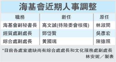 去年底,海基會(huì)人事地震,包括綜合處、經(jīng)貿(mào)處、文化處在內(nèi)等“一正處長(zhǎng)、二副處長(zhǎng)”都未獲續(xù)任。近期被視為是海基會(huì)最后一位前朝人馬的林淑閔,日前離職,遺缺由高文誠(chéng)遞補(bǔ),這項(xiàng)新人事也待“陸委會(huì)”核備。
