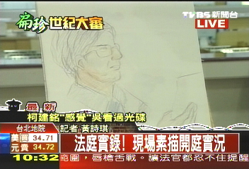 而在法庭內(nèi)的素描,坐在被告席上的陳水扁看來(lái)有些駝背,面前擺著一臺(tái)計(jì)算機(jī),所有對(duì)話都會(huì)在計(jì)算機(jī)中顯現(xiàn)出來(lái),在被告席左邊的是律師席,坐著陳水扁律師鄭文龍,而被告席正對(duì)面就是審判者蔡守訓(xùn),蔡守訓(xùn)一開(kāi)始問(wèn)陳水扁是不是心跳加速、會(huì)氣喘?陳水扁連話都沒(méi)有說(shuō),只是點(diǎn)點(diǎn)頭,低頭看著計(jì)算機(jī)屏幕。