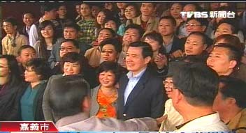 馬英九于前晚夜宿嘉義市中信飯店,1日一早在飯店前,巧遇100多名大陸旅客,都擠著要和他合影,馬英九索性主動(dòng)走入大陸游客群中來個(gè)大合照。