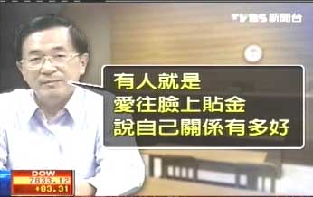 陳水扁說“我太太身體不方便,都是用電話聯(lián)系,有人就是愛往臉上貼金,說自己關(guān)系有多好,明明只到過官邸接待室,就說自己天天走官邸,辜仲諒就是其中一個(gè),我不可能有那么多時(shí)間,一個(gè)禮拜見他一次,他卻出去就講,我跟陳水扁關(guān)系有多好,樹大招風(fēng)就是這樣!