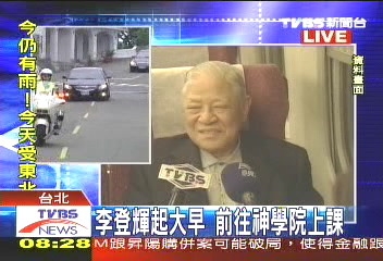 中新網(wǎng)4月7日電 李登輝重拾書本?據(jù)臺(tái)灣TVBS報(bào)道,他每周到臺(tái)灣神學(xué)院選修“宗教改革神學(xué)”相關(guān)課程,7日上午8點(diǎn)不到就已經(jīng)抵達(dá)神學(xué)院,隨扈車隊(duì)相當(dāng)?shù)驼{(diào)直接開進(jìn)神學(xué)院,預(yù)計(jì)今天要上的是“改革宗學(xué)院傳統(tǒng)”這門課程。