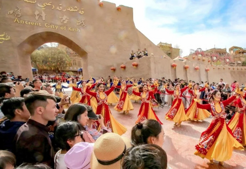 圖為游客在新疆喀什古城景區(qū)觀看歌舞表演。