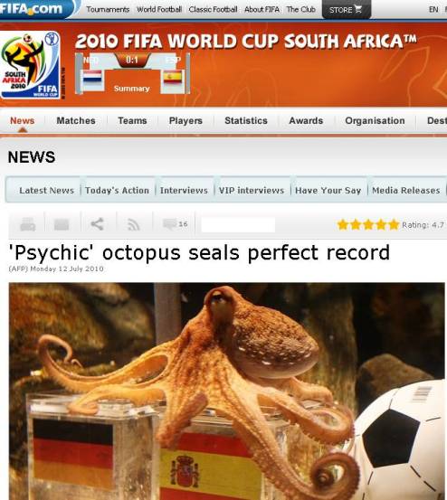 章魚(yú)保羅預(yù)測(cè)決賽中西班牙將擊敗荷蘭隊(duì)奪冠。雖然比賽被拖到加時(shí)的116分鐘,但伊涅斯塔的進(jìn)球還是讓保羅的神奇再次延續(xù),這也是它在本屆世界杯上成功預(yù)測(cè)的第8場(chǎng)比賽,而且其預(yù)測(cè)成功率為100%!它所預(yù)測(cè)的比賽,除了這場(chǎng)決賽,還有德國(guó)隊(duì)的全部七場(chǎng)比賽。