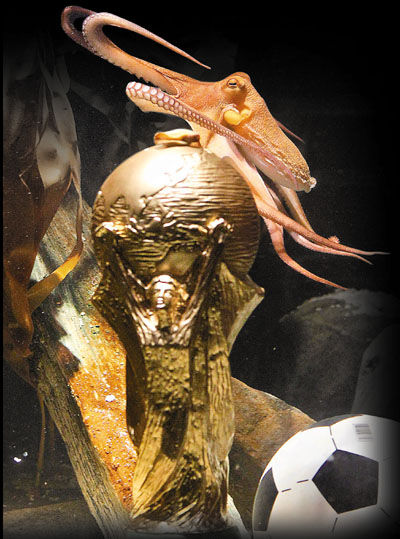 中新網(wǎng)7月13日電 英國(guó)廣播公司報(bào)道,因成功預(yù)測(cè)德國(guó)隊(duì)在南非世界杯賽中的每場(chǎng)比賽結(jié)果以及西班牙隊(duì)奪冠而聞名于世的章魚(yú)保羅被授予一個(gè)世界杯獎(jiǎng)杯模型。