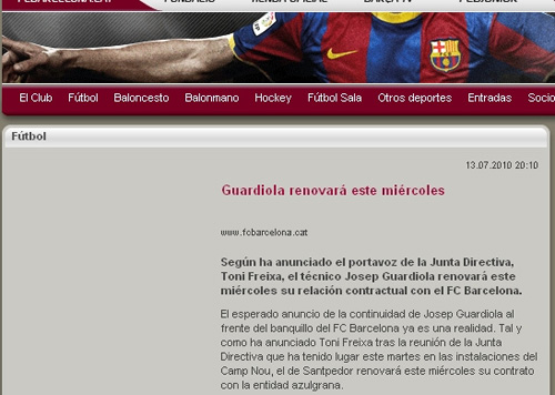中新網(wǎng)7月14日電 北京時間今日,西班牙巴塞羅那俱樂部在其官網(wǎng)官方宣布,主帥瓜迪奧拉將于當(dāng)?shù)貢r間星期三與球隊續(xù)約。據(jù)西媒體報道,瓜迪奧拉新合約將為期三年。