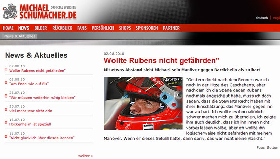 舒馬赫在官網(wǎng)上稱:“再次看過我與魯本斯之間的錄像后,我覺得干事的處罰是正確的。那種強(qiáng)硬的防守確實(shí)太過分了。我沒有發(fā)覺我的動(dòng)作帶給他的危險(xiǎn)。如果他這么覺得,那么我要說:對不起,我不是故意的!