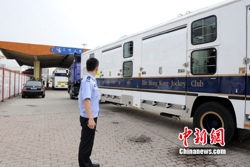 10日清早7時40分,香港賽馬會的兩輛粵港兩地牌貨車(車內(nèi)運有18匹賽馬)和6輛隨行保障車由香港經(jīng)皇崗口岸入境,皇崗邊檢站警戒隊按預(yù)案要求,派警車從橋頭將運馬車輛一行安全引帶至貨檢入境查驗場地?吭谥付ǖ呐R時候檢區(qū)域,并擔(dān)負(fù)警戒監(jiān)護(hù)工作。在檢驗檢疫部門進(jìn)行消毒的同時,貨車檢查隊、小(客)車檢查隊的民警立即聯(lián)動,高效、快捷、優(yōu)質(zhì)的為入境機動車司機、馬童及隨行人員共33人的證件辦理查驗手續(xù)。8時50分,運馬車輛及隨行人員離開皇崗口岸前往廣州亞運馬術(shù)場。