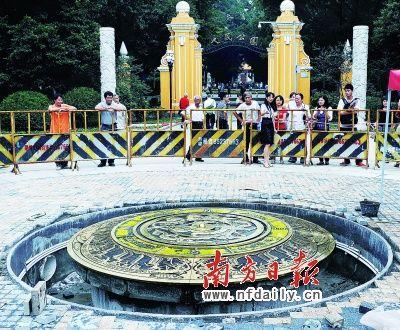 據(jù)介紹,原點(diǎn)標(biāo)志表面微凸,高出地面15厘米,直徑3米。標(biāo)志物外圍采用灰、黑兩色花崗巖作襯邊,沿放射線方向鑲嵌銅條,花崗巖表面陰刻了廣州建城歷史簡(jiǎn)記。內(nèi)側(cè)圓盤采用2厘米厚的黃銅板和巴西水晶石制成,重達(dá)3噸,圖案取材于南越王墓出土的“龍鳳玉佩”和“羽人駕舟”浮雕圖案,彰顯了嶺南文化特色。