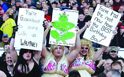 憑借墨西哥國腳前鋒赫爾南德斯的梅開二度,曼聯(lián)在客場2:1小勝斯托克城。但在比賽中,主隊球迷沒有放過與曼聯(lián)續(xù)約后去迪拜度假而缺陣的魯尼。三位斯托克城的球迷男扮女裝,戴上假發(fā),變身穿著性感裙裝、佩帶假胸的妖冶女郎,舉著標語牌,對魯尼這個他們眼中的丑角進行大肆嘲諷與惡搞,顯然是暗地里指魯尼喜歡這些裝束夸張的妓女。(許凱)