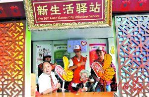 周家禎向韻平夫婦在上下九步行街的亞運(yùn)新生活驛站為市民提供志愿服務(wù)。