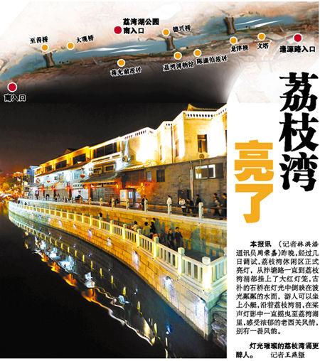 廣州日報11月3日報道 昨晚,經過幾日調試,荔枝灣休閑區(qū)正式亮燈,從泮塘路一直到荔枝灣涌都掛上了大紅燈籠,古樸的石橋在燈光中倒映在波光粼粼的水面,游人可以坐上小艇,沿著荔枝灣涌,在槳聲燈影中一直搖曳至荔灣湖里,感受濃郁的老西關風情,別有一番風韻。