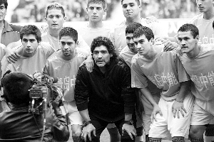 按照此次溫暖中國行的計(jì)劃,馬拉多納帶領(lǐng)的阿根廷隊(duì)將與李明領(lǐng)銜的山東國腳進(jìn)行一場義賽,所得款項(xiàng)捐獻(xiàn)給中國紅十字基金會(huì),屆時(shí)老馬將會(huì)親自登場比賽。下午14時(shí)30分左右,奧體中心體育場已經(jīng)坐了一大半球迷,有人穿著阿根廷國家隊(duì)的藍(lán)白球衣,有人舉著紀(jì)念圍巾。球場上兩支隊(duì)伍在熱身,并不見主角馬拉多納的影子,工作人員稱他還在飛機(jī)上。
