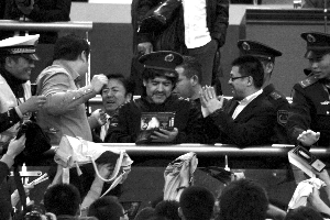 簽名、繞場一周、顛球、演講……馬拉多納用盡了招數(shù)也沒能取悅昨日來濟(jì)南奧體中心觀看比賽的球迷,因?yàn)樗麄兌际菦_著“老馬保證登場不少于20分鐘”這個(gè)噱頭而來,但是球王并未如約展示球技。