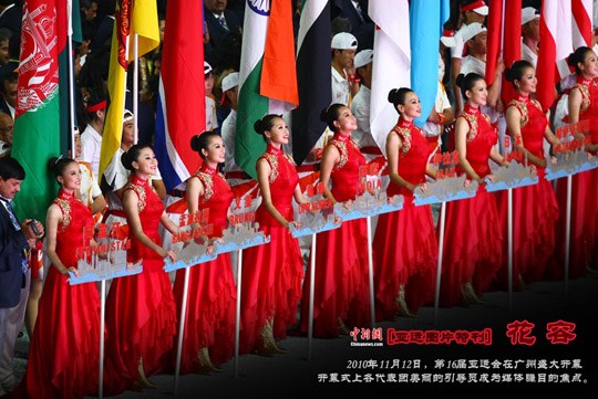 中新社廣州11月12日電(記者 盧巖) 第16屆亞運(yùn)會(huì)今晚在廣州市海心沙拉開了帷幕。作為賽會(huì)主角的運(yùn)動(dòng)員們?cè)谌雸?chǎng)式上亮相,在點(diǎn)燃開幕式氣氛的同時(shí),也將自己繪成一道道靚麗的風(fēng)景線。