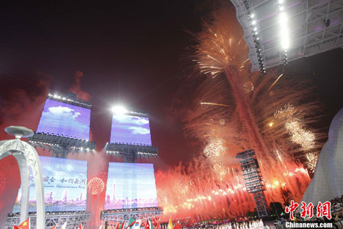 隨著中國(guó)總理溫家寶正式宣布亞運(yùn)會(huì)開幕,整個(gè)會(huì)場(chǎng)和天空再次被無數(shù)絢爛的煙火照亮。