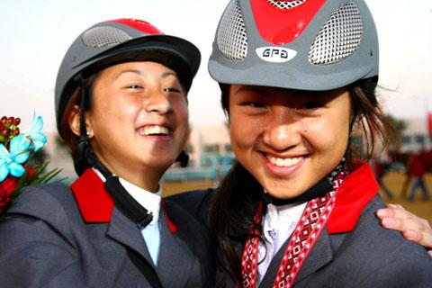 這對21歲的姐妹從9歲起開始騎馬,到現(xiàn)在已經(jīng)12年了。2006年,當(dāng)時(shí)只有17歲的兩姐妹首次代表中華臺(tái)北隊(duì)參加多哈亞運(yùn)會(huì),陳少曼奪得場地障礙賽銀牌,陳少喬奪得個(gè)人第4,一時(shí)間蜚聲華人騎術(shù)圈。雖說是出身億萬富豪之家,但兩姐妹沒有半點(diǎn)嬌小姐的樣子。頭盔、白馬褲、馬靴,高挑的身材,兩姐妹在駿馬飛馳的賽場上格外英姿颯爽。