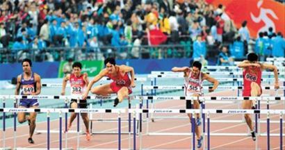 昨天,劉翔(中)奪得亞運(yùn)會(huì)男子110米欄三連冠。