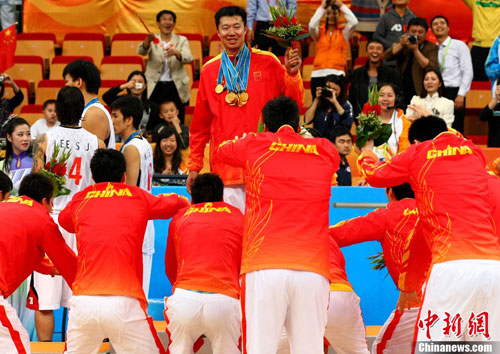 從NBA回到中國,王治郅找到了適合自己的位置。在姚明、易建聯(lián)缺席之際,這位第四次、也是最后一次出征亞運大賽的老將就是一根定海神針。他不一定是每場比賽得分最多的,但他總會在關(guān)鍵時刻力挽狂瀾。中國男籃成功衛(wèi)冕后,所有隊員將金牌掛在他的脖子上并“頂禮膜拜”——這位傷病纏身的33歲老將,擔(dān)當(dāng)?shù)闷疬@份榮譽。