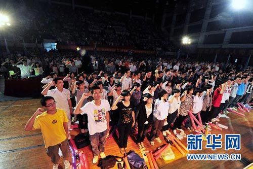 10月23日晚,華南師范大學(xué)舉行2010廣州亞(殘)運(yùn)會(huì)志愿者出征誓師儀式暨2010年迎新生文藝晚會(huì),該校1860名亞(殘)運(yùn)會(huì)志愿者代表參加晚會(huì)。身為廣州亞運(yùn)會(huì)志愿者形象大使的羽毛球名將謝杏芳來到活動(dòng)現(xiàn)場(chǎng),帶領(lǐng)大家共同宣誓。
