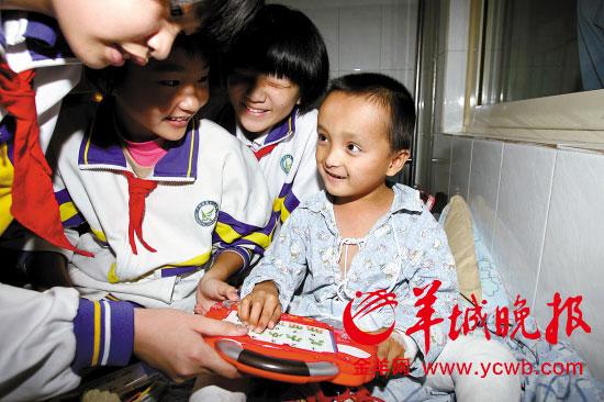 6歲的小華琛坐在兒童醫(yī)院的病床上,雙腳打著石膏———這是他第三次打石膏做矯正。他從小失去父母,又患有先天性馬蹄內(nèi)翻足,性格內(nèi)向。不過,來廣州近一個月的日子,他不斷被熱心人改變著。1日,廣州市第13中學8名學生代表也來到兒童醫(yī)院探望小華琛(見右圖)。