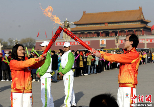 10時(shí)21分,中共中央政治局委員、廣東省委書(shū)記汪洋用在北京中華世紀(jì)壇采集的圣火火種,點(diǎn)燃了火種盆。習(xí)近平神情莊重,從火種盤(pán)點(diǎn)燃火炬,然后高高舉起火炬,向人們展示。