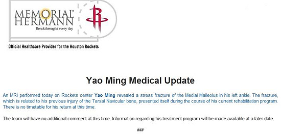 中新網(wǎng)12月17日電 北京時間今日,火箭官方向媒體發(fā)放的新聞稿中表示:中鋒姚明日前接受了核磁共振檢查,但結(jié)果顯示其左腳踝再次出現(xiàn)應(yīng)力性骨折,回歸賽場仍舊遙遙無期。隨后火箭媒體《休斯頓紀(jì)事報》專家更撰文質(zhì)疑,稱昔日的聯(lián)盟最佳中鋒或許就將因此告別職業(yè)生涯。